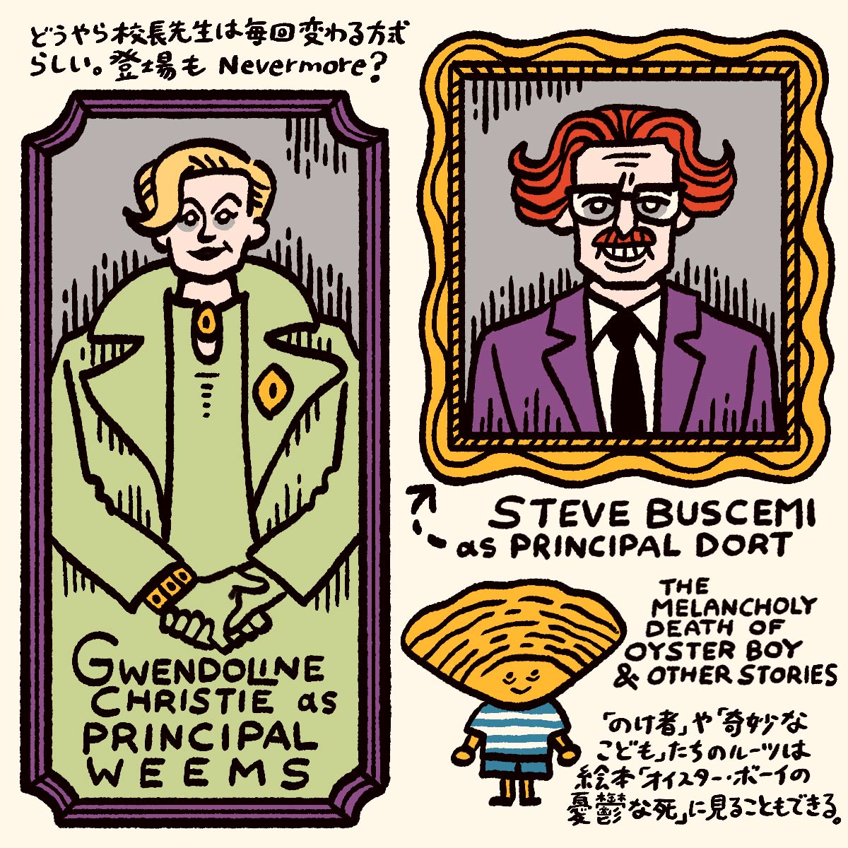このドート校長もまたシーズン2にて退場ということになるが、シーズンごとに特定の先生が交代するこのお約束(というほどまだ繰り返されてはいないのだが)から、『ハリー・ポッター』シリーズで作品ごとに交代する「闇の魔術に対する防衛術」の先生を連想したのはぼくだけだろうか。エドガー・アラン・ポーの短編「大鴉」のフレーズから取られた校名によって、校長としての続投は「二度とない」(Nevermore)という呪いにでもかかっているのだろうか。すでに制作が発表されているS3でも、また新たな校長が現れる可能性は高いので、誰が演じるのか想像するのも楽しいだろう。