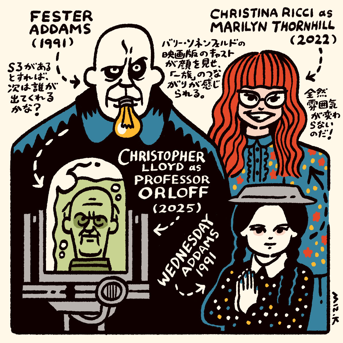 ともに本作を手がけたアルフレッド・ガフとマイルズ・ミラー、そして主演のジェナ・オルテガとは、S1~2の合間に『ビートルジューズ』(88)の36年ぶりの続編を生み出すことになるのだが、それはまた次回。