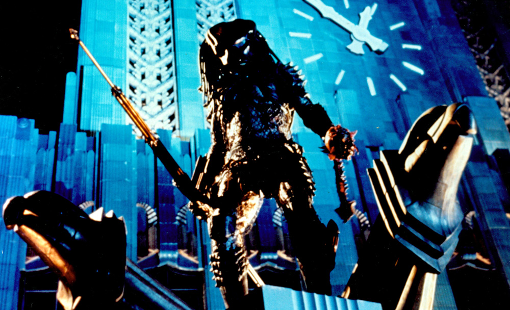 前作の好評を受けて制作された第二弾。監督は後にドラマ『24』(01)シリーズの監督として名を挙げるスティーヴン・ホプキンス。主演は80年代を代表するアクション映画にして、バディアクションの金字塔『リーサル・ウェポン』(87)で心優しい中年刑事を演じたダニー・グローヴァー。前作はジャングルだったが、今回は記録的な酷暑に襲われるロサンゼルスの街を舞台に、人間とプレデターの死闘を描いた。前作同様、冒頭からいきなり大銃撃戦が起きて刑事映画っぽく始まるが、中盤からジャンルはSFホラーへ。舞台は都会であるためか、前作以上にジャンル横断感が強い。また前作よりもプレデターのキャラクターや設定に深掘りも行われた。負け惜しみにも見えた自爆攻撃から一転、プレデターに勝った刑事を一族みんなで祝福するなど、プレデター側のカッコよさ/底知れなさに磨きがかかる。ビルの上で咆哮するキメのカットはあまりにも有名。そして本作に登場するプレデターの宇宙船の中には、『エイリアン』(79)のゼノモーフの頭蓋骨があった。単なるお遊びの要素だったが、これが後に重大な意味を持ってくる。