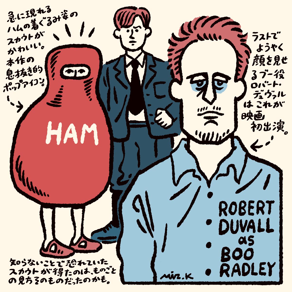 兄妹を襲ったのは、もちろんアティカスを逆恨みしたボブ・ユーエルだった。彼は裁判のあとでアティカスに対して報復を仄めかしていたから、十分予想できることだ。しかし、スカウトを驚かせたのは自分たちを救った人物の方だった。驚いたことに、それはあの謎の隣人、ブー・ラドリーだったのだ。ここでようやくロバート・デュヴァルが登場するが、これが彼の映画デビューの瞬間である。子どもたちの想像の中でほとんど怪物と化していたブーは、実際には繊細そうでどこかに無垢さを残した男だった。十分に大人に見えるが、内面は父親によって家に閉じ込められた時点のままといったような感じだ。無口で振る舞いにぎこちなさがあるのは、長く外界と切り離されていたからだろう。